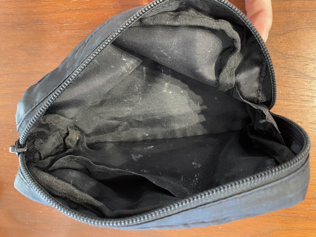 ちなみに、このポーチはおもてがナイロン製・うらがポリエステル製です。